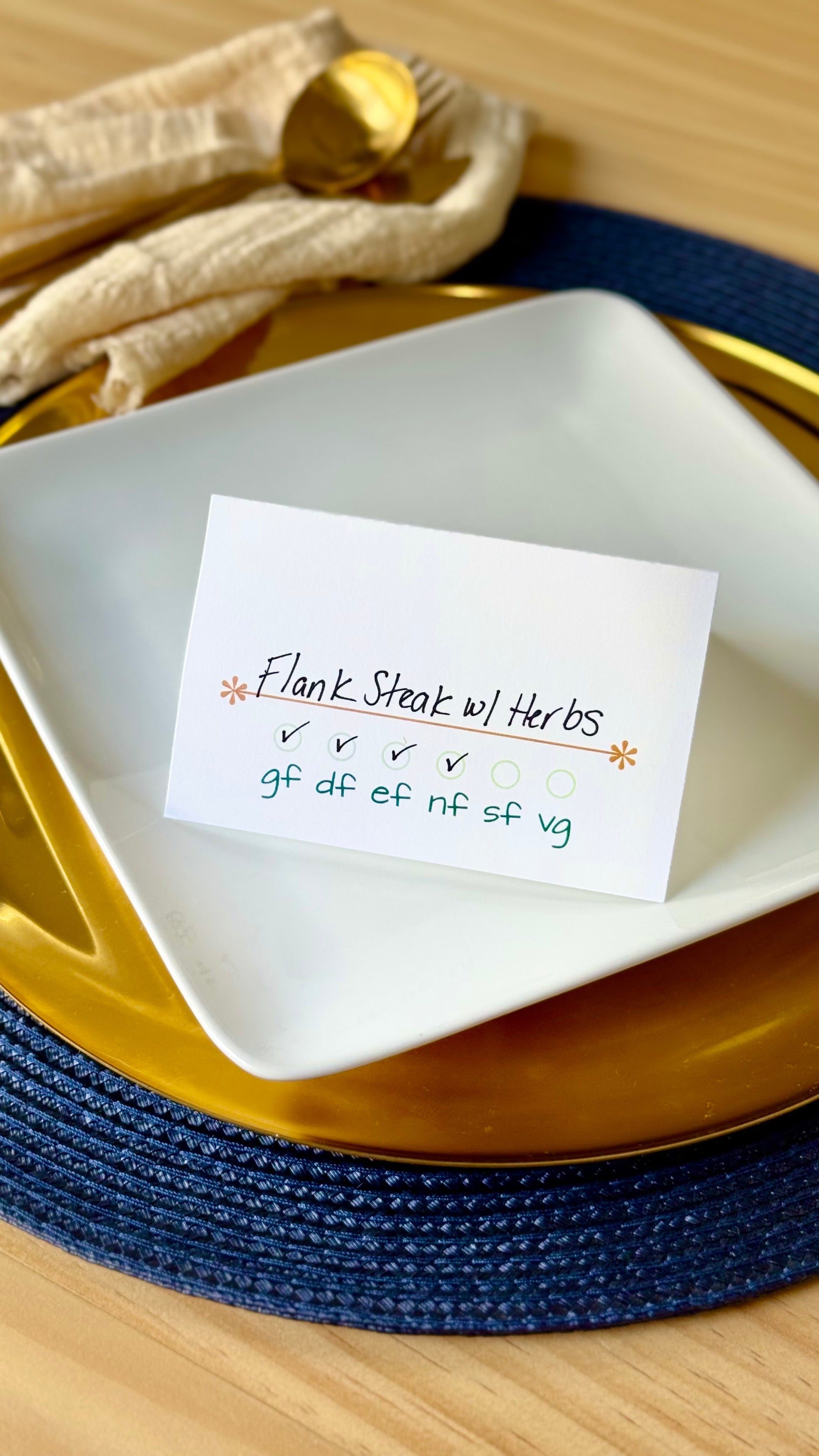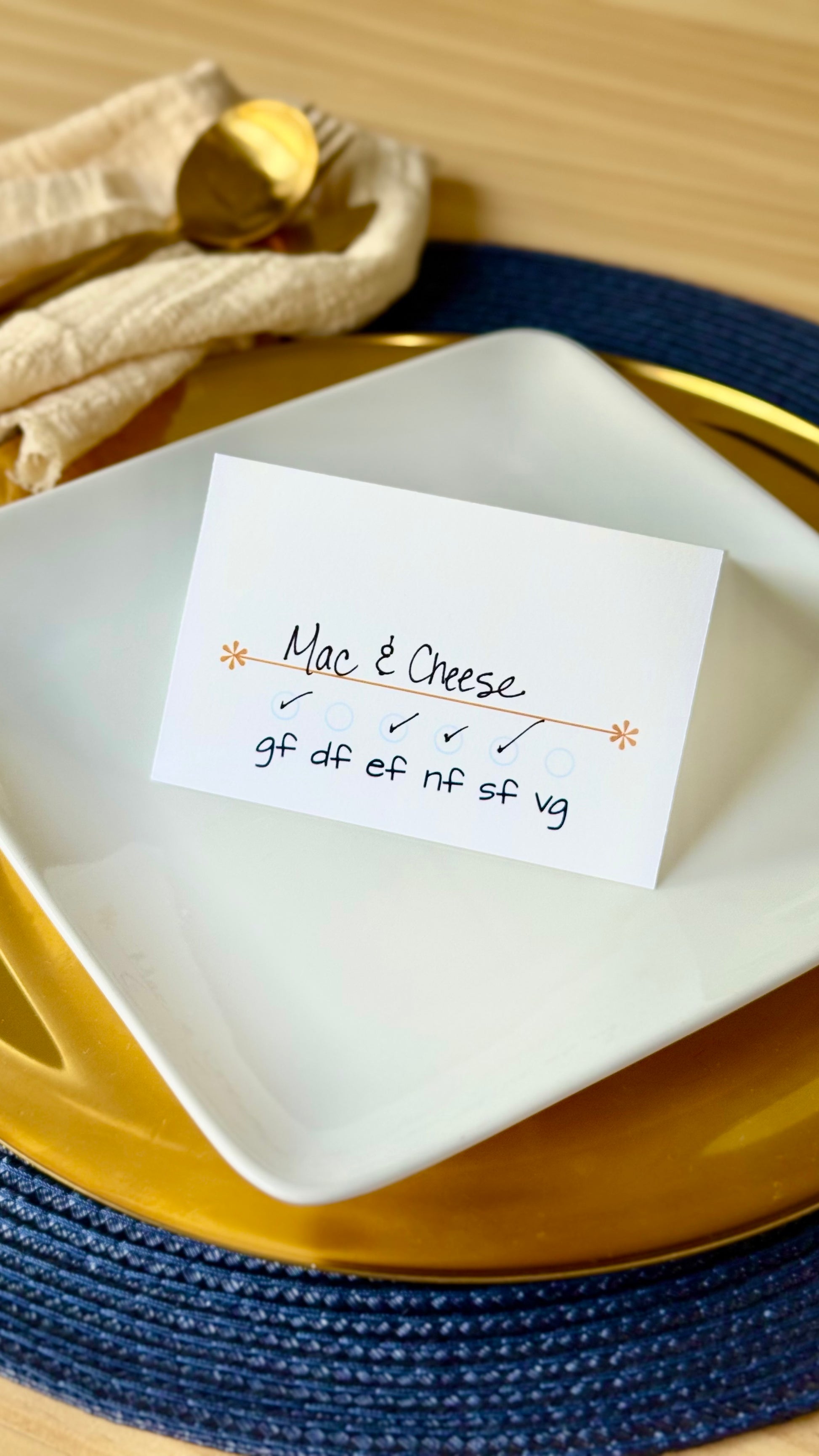 Let guests know what you are serving and what food allergens are in each dish in a modern & beautiful way. If your guests bring a dish, just fill out a card to put next to their dish. Keep everyone safe & informed at your next gathering with these customizable cards. Select your choice of color and design, sold in packs of 10. They arrive beautifully boxed and are wonderful for gifting.